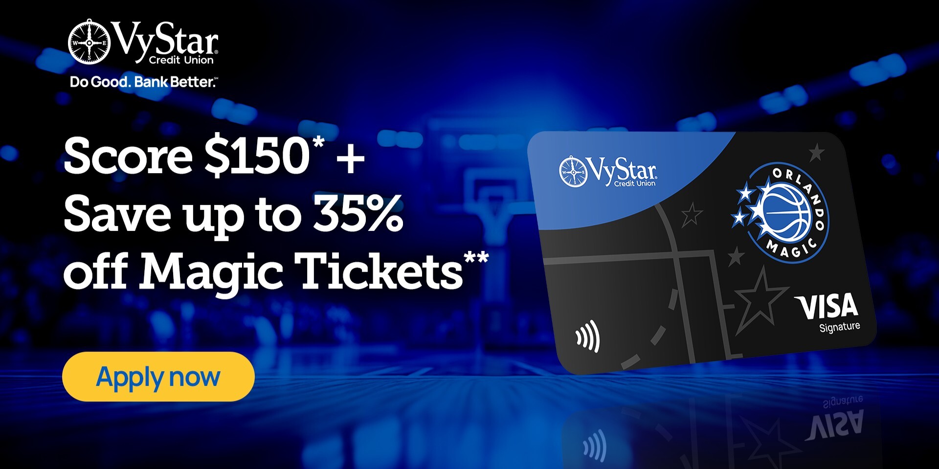 **VyStar Credit Union members can receive up to 35% off tickets to select Orlando Magic home games using your VyStar debit or credit card. You can view game options and special offers. The discount will be unlocked when the card number is entered. ©2025 VyStar Credit Union.
